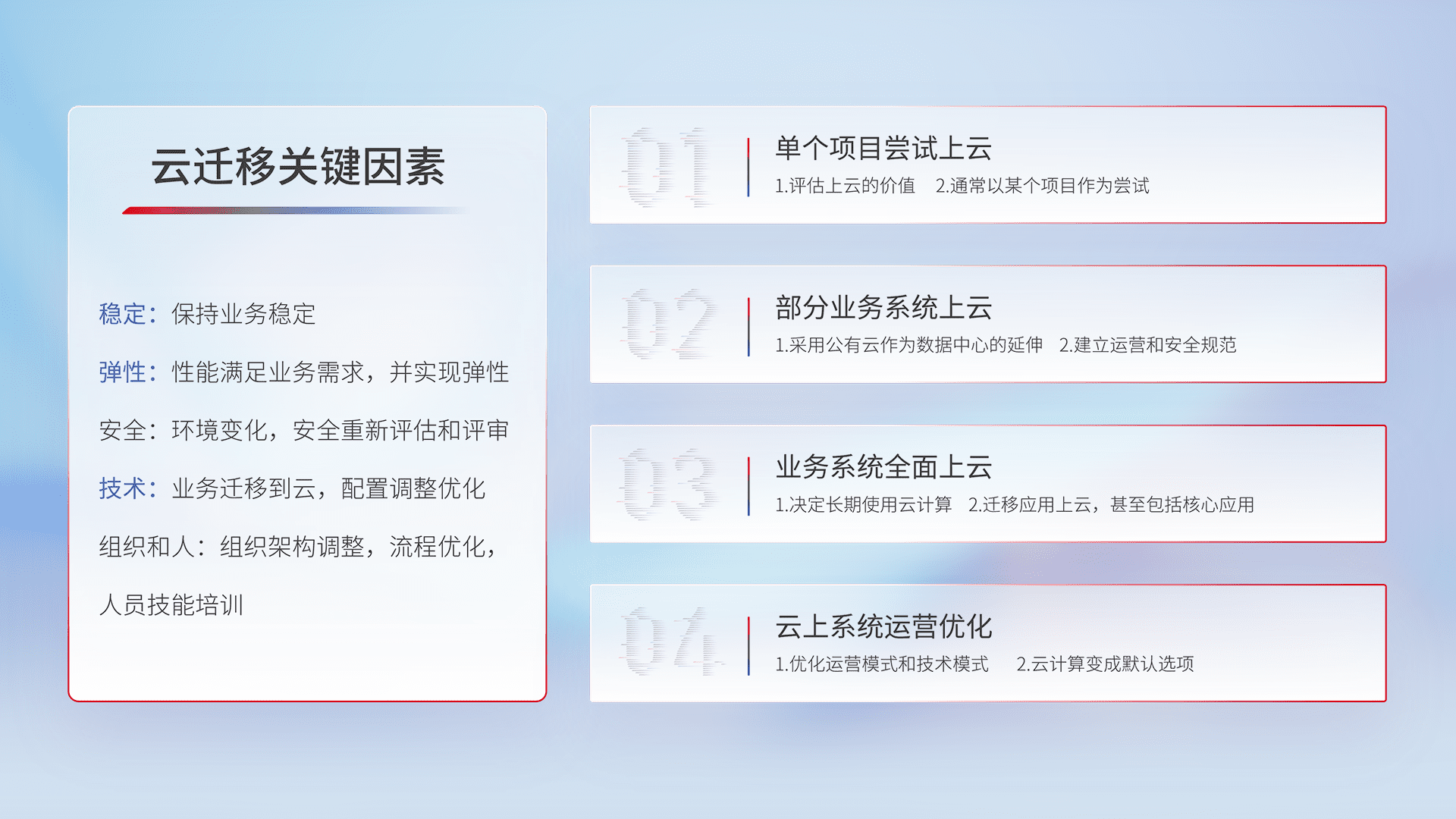 结合实际业务,,,从规划设计、、、、云平台选型、、、云原生改造、、、、数据迁移、、集成交付,,,,迁移全过程为客户识别最佳上云路径,,,做好风险识别管理,,设计网络架构、、、、身份权限、、、、安全审计合规、、、操作审计、、、日志审计、、监控告警策略、、、、多站点容灾设计等,,,对云上基础设施进行整体规划,,提升IT治理水平,,以满足弹性、、高可用、、高性能的需求。。。