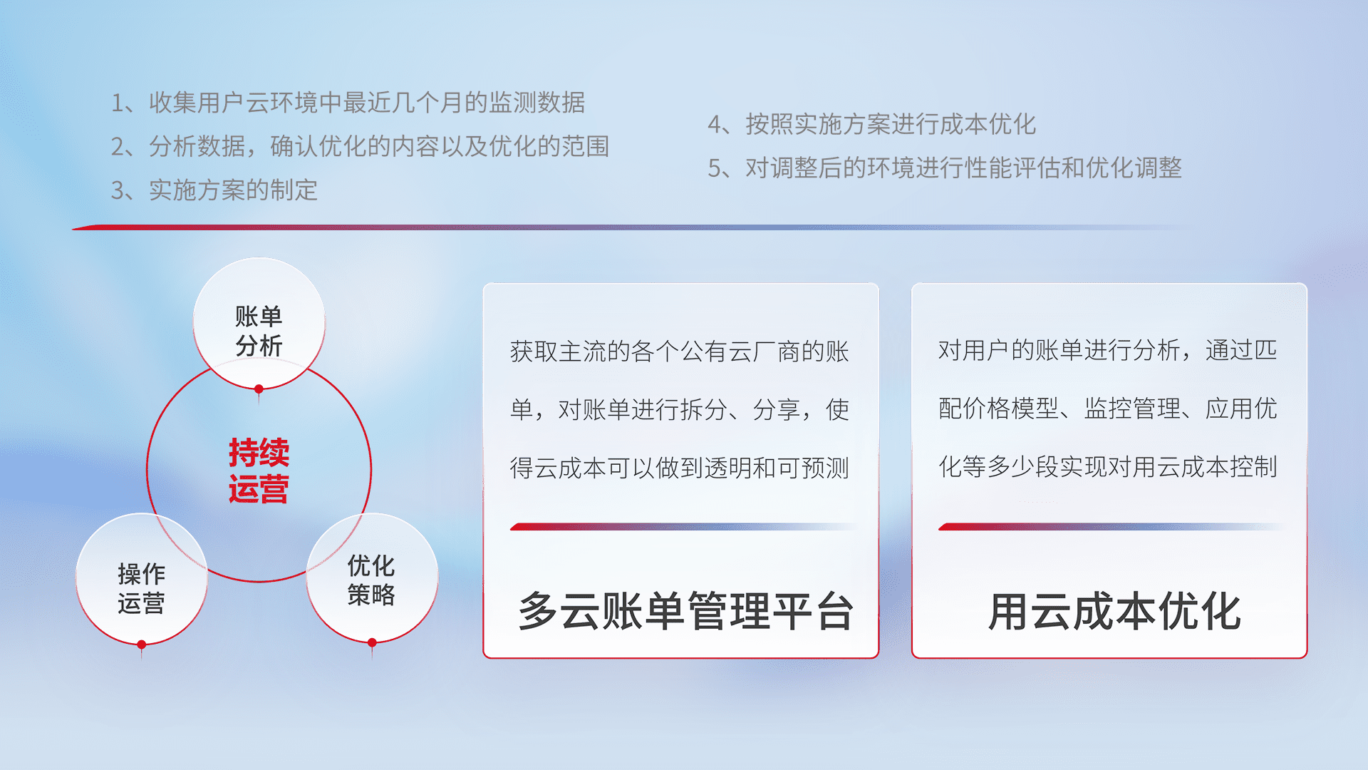 通过多云纳管,,,,以统一的资源数据模型把客户的云资源进行抽象和封装,,,,进而实现对多云资源的统一操作,,保障云资源管理的可靠性、、、稳定性与可用性。。。。量身定制化运维内容,,,,配置、、开发运维、、补丁管理、、备份、、、、监控、、认证和访问管理、、、审计和日常巡检等,,保障在用云过程中的可靠度,,稳定度以及高可用率。。。。