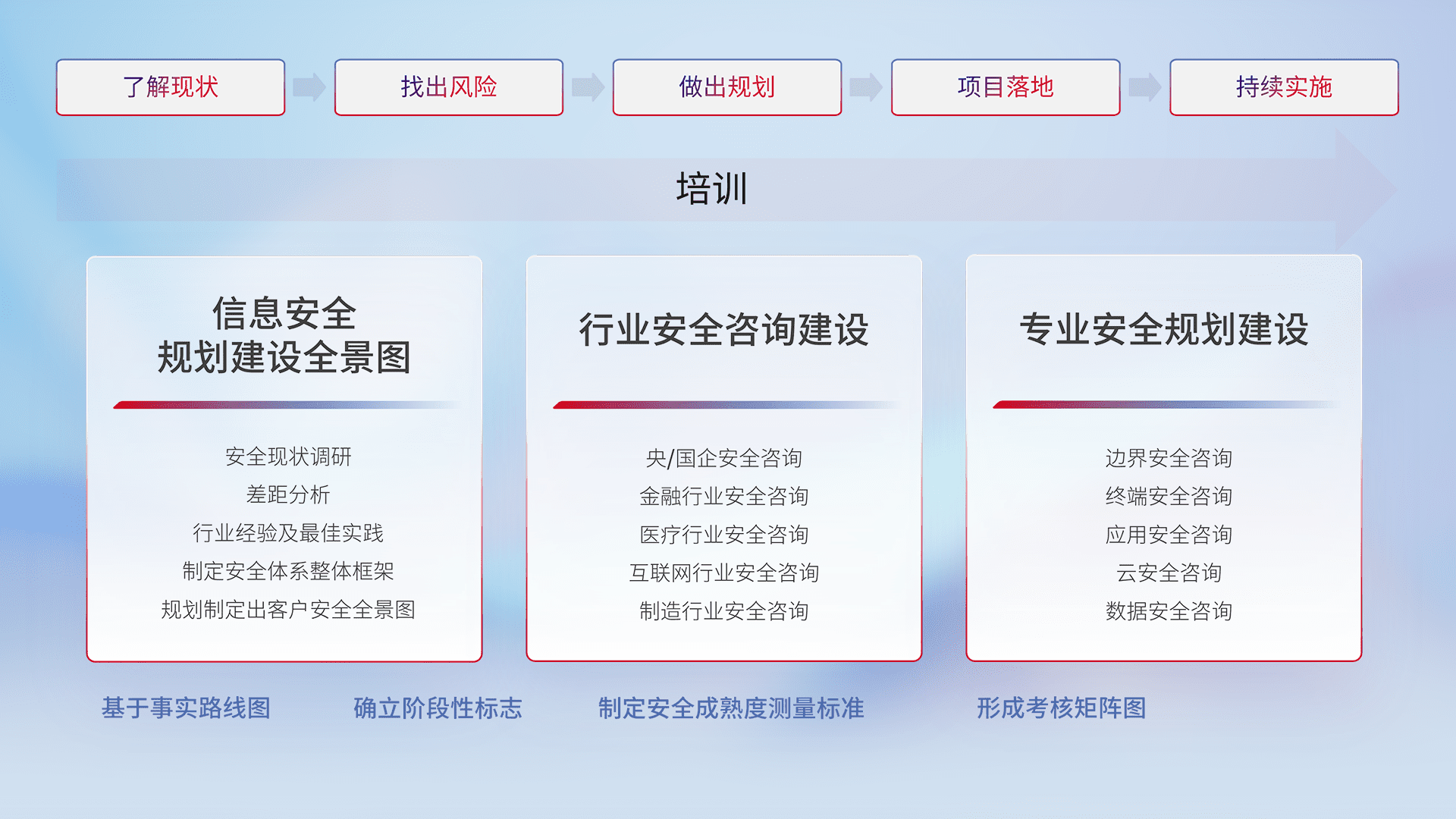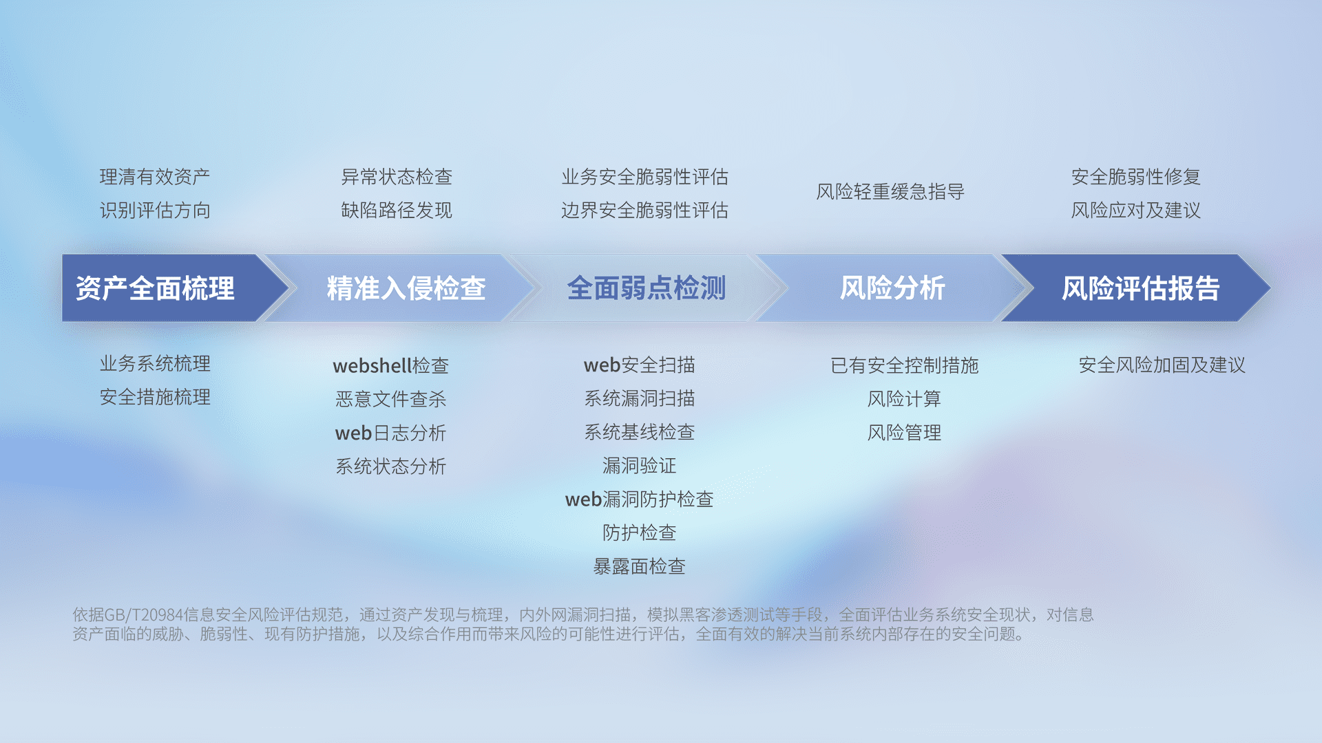 针对客户行业特性,,以专业的安全服务+多厂商联合解决方案提供专属的一站式安全管理服务,,帮助客户全面感知网络空间威胁,,基于识别、、检测、、、、分析、、、防护、、、监测、、响应的服务理论模型,,从方案咨询、、、、集成交付、、、、评估验证、、、优化加固、、、、运维运营,,,致力于为客户提供完整的闭环管理式安全服务。。。以实战经验为客户打造高抵御风险的安全体系,,,帮助客户发现威胁、、、、对抗威胁、、、、处置威胁,,,,不断积累安全对抗能力,,,持续保障数字化安全。。